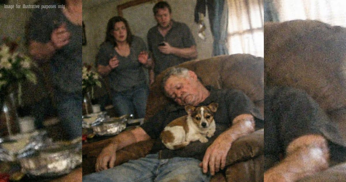 His head had slumped to one side, jaw slack, one hand hanging off the armrest like it had simply run out of reasons to hold on. And there, right on his chest—on the forbidden upholstery—was Mom’s little dog, Mabel, curled into a tight comma of brown-and-white fur.