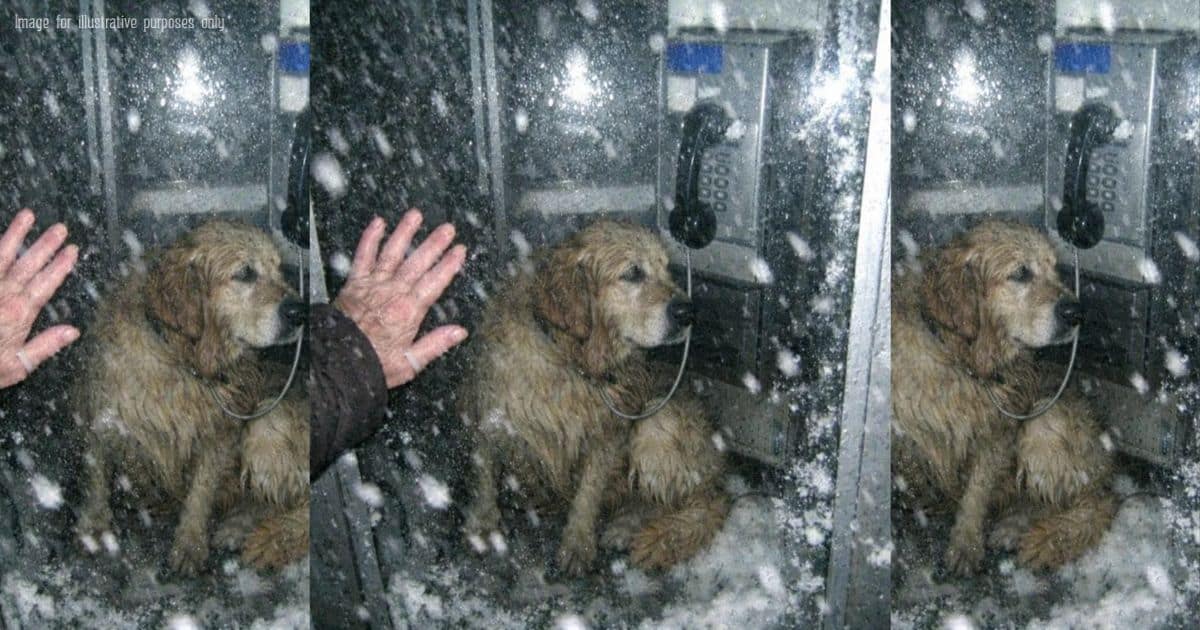 He sat perfectly still, his nose pressed against the dangling phone receiver, as if waiting for a call that would never come. His fur was matted with ice, and around his neck hung a collar that looked too heavy, blinking with a faint red light.
