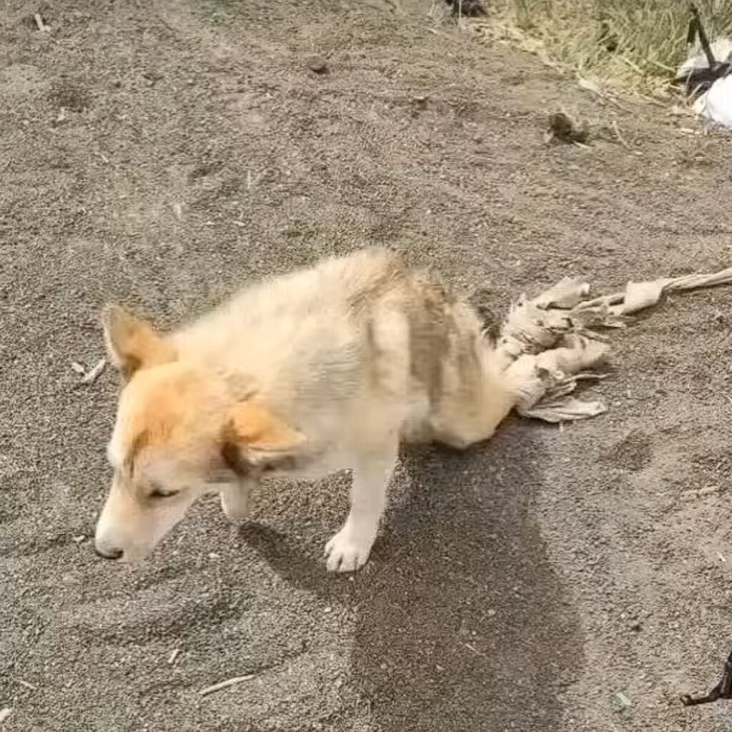 The sun hung high over the dusty path. A small dog inched forward, his body thin and tired from the long day.