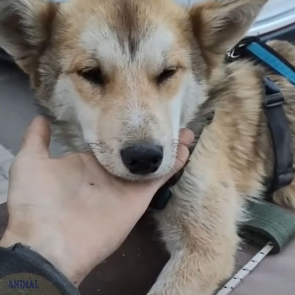 The dog lay still. No fight in him. As if he understood this was a safe place now. Their eyes met again. Pain on one side, kindness on the other. A quiet bond formed there, in the dim light of the room.