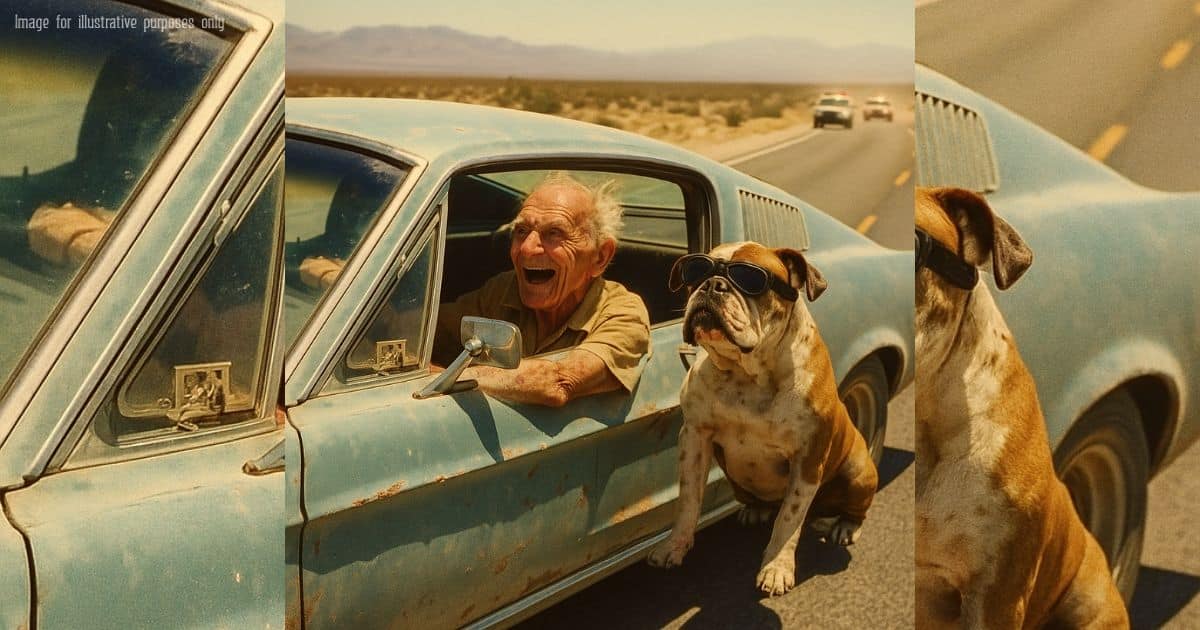 Sun wavered off the lane markers as the fastback carved heat waves into a mirage. The paint had the weary shine of something loved and left in a garage too long. In the driver’s seat, the old man held the wheel like he was holding hands with memory. In the passenger seat, the bulldog sat upright and calm, chin lifted like a captain.