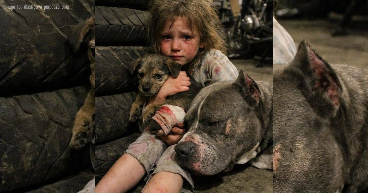 The pitbull dropped his belly to the concrete floor and army-crawled forward. He gently rested his big, blocky head on the girl’s bruised knee and softly licked the tears off her cheeks. Then, he nudged the injured puppy, offering a comforting lick to its trembling head.