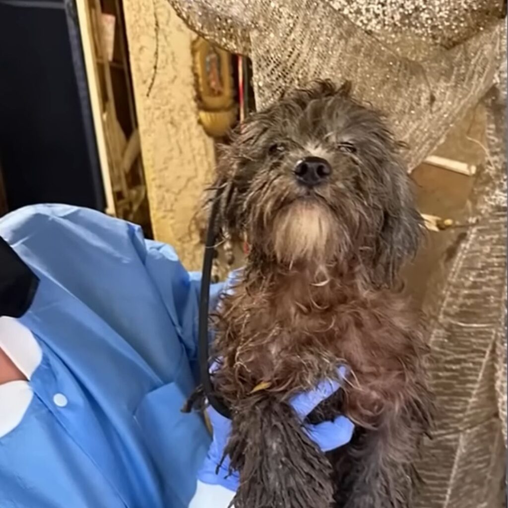 An old dog with long fur lay still as they cleaned him. His breathing steadied. In his eyes, a flicker—perhaps gratitude, or just relief.